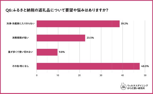 ふるさと納税の返礼品についての要望や悩みは「冷蔵・冷凍庫に入りきらない」(39.2%)が最も多く、冷蔵・冷凍庫の収納スペースの問題がふるさと納税を利用するうえで大きな懸念点になることがわかる。