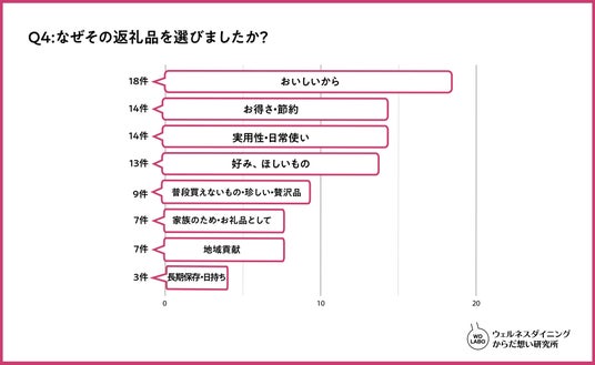 返礼品を選ぶときは、「美味しさ」(18件)が最も重視されており、次いで「お得さ・節約」、「実用性・日常使い」(14件)となった。上記の理由からも、おいしく日常で使いやすい食品が多く購入されていることがわかる。
