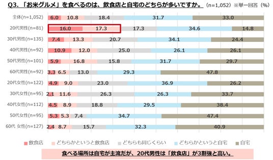 ・食べる場所は自宅が主流だが、20代男性は「飲食店」が3割強と高い。