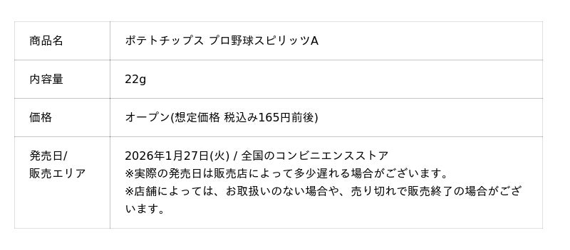 カルビー株式会社(本社:東京都千代田区、代表取締役社長兼CEO:江原 信、以下、カルビー)は、株式会社コナミデジタルエンタテインメント(本社:東京都江東区、代表取締役社長:早川 英樹、以下、KONAMI)の運営するモバイルゲーム「プロ野球スピリッツA」(以下、プロスピA)とコラボレーションし、選手のカードが2枚付いた商品『ポテトチップス プロ野球スピリッツA』(カードは全48種類+シークレット)を、2026年1月27日(火)から全国のコンビニエンスストアで数量限定発売します(なくなり次第、終了)。