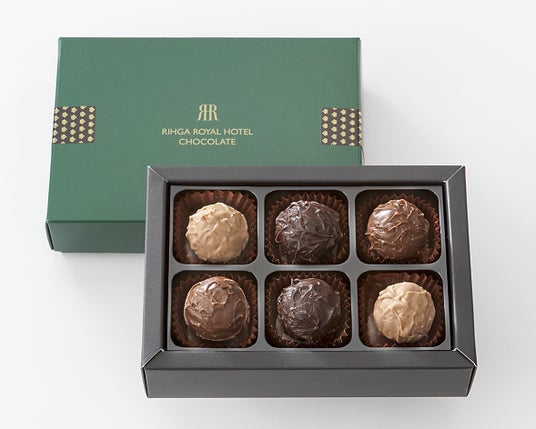 ピスタチオ風味・ヘーゼルナッツ風味・塩キャラメル風味が楽しめるトリュフ6個の詰合せ。