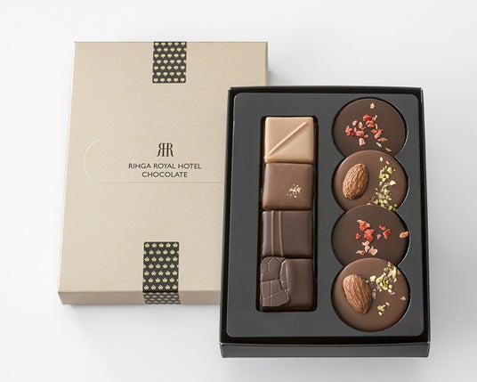 スイート&ミルクのプレートチョコと、ビター&ジャンドゥーヤ、アーモンドクランチなど7種のテイストでお届けする優雅なアソート。