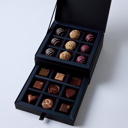一粒ごと風味の違う食感をお楽しみいただけるチョコレート18種を2段に詰め合わせた豪華なアソート。