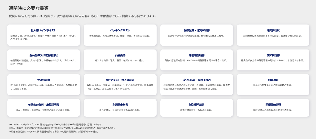 規制品や関税優遇を利用する場合などは、貨物内容に応じて追加書類が必要となります。