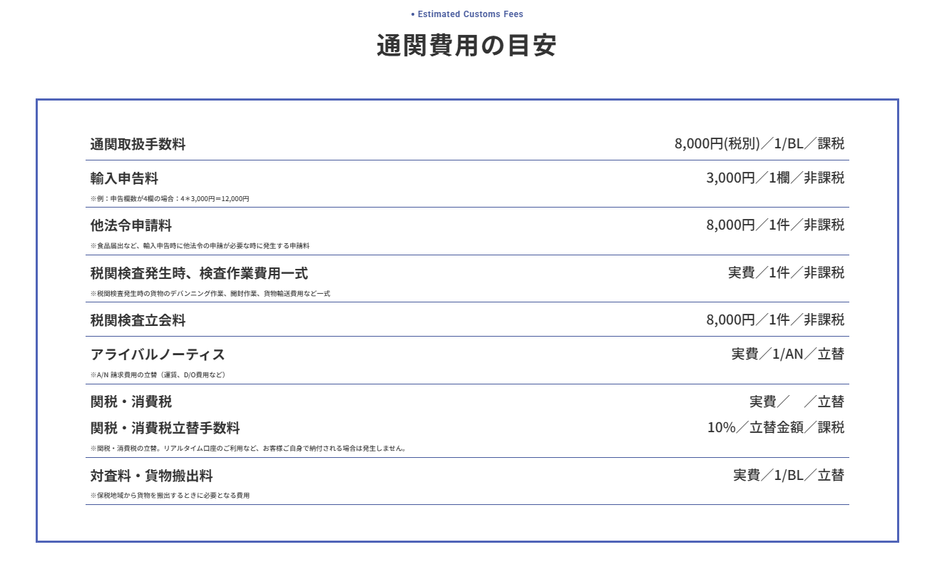 ・通関取扱手数料:8,000円(税別)/1BL