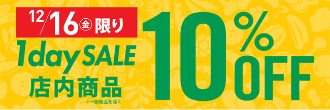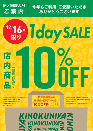 株式会社紀ノ國屋(本社:東京都新宿区市谷砂土原町3丁目5番地 代表取締役社長:富田 勝己)は、12月16日(金)1日限りのお得なセール「1day SALE」を、インターナショナル(青山店)、国立店、等々力店、吉祥寺店、鎌倉店の5店舗で開催いたします。