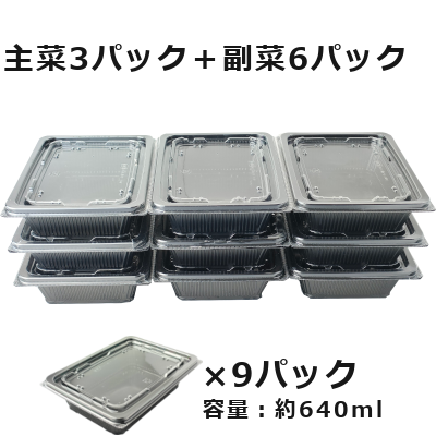 主菜が3パック、副菜が6パックの合計9パック入ったお惣菜です。3~4人前3回分のおかずの分量になります。