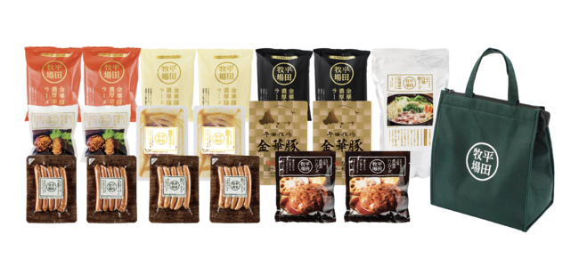 商品内訳:極みソーセージ × 2 / 極み荒挽きソーセージ × 2 / 煮込み三元豚ハンバーグ × 2 / 金華豚肉巻きおにぎり × 2/金華豚濃厚醤油ラーメン × 2 / 金華豚濃厚豚骨ラーメン × 2 / 金華豚濃厚辛味噌ラーメン × 2/金華豚特製カレー × 2 / 金華豚白湯鍋スープ × 1 / 金華豚特製みそ漬け × 2 / 平田牧場保冷バック付き