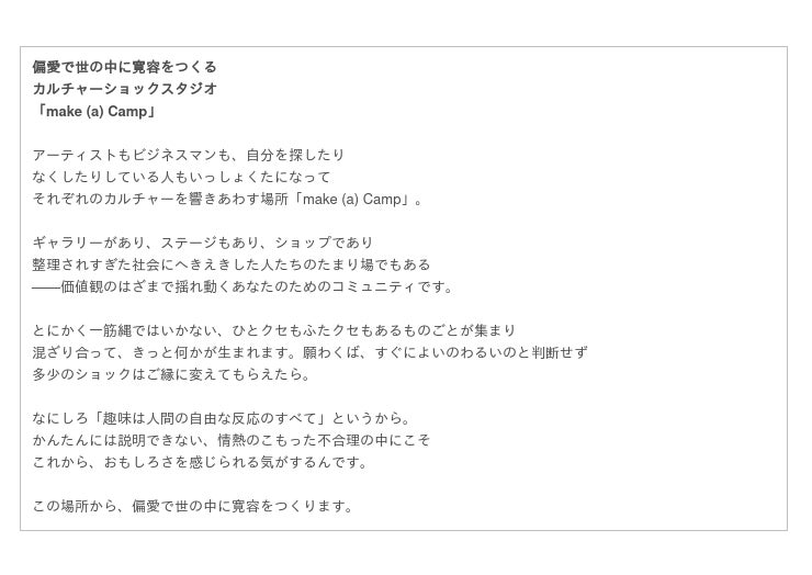 ▽カルチャーショックスタジオ『make (a) Camp』スペース概要