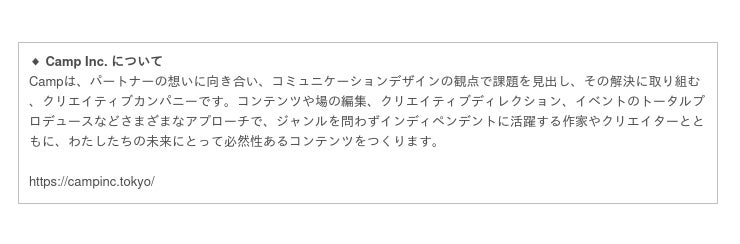 企画運営 :Camp Inc.( https://campinc.tokyo/ )