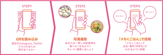 InstagramもしくはTwitterで、指定のアカウントをフォローし、ハッシュタグ「#ちくごはん」で、店名と場所がわかるように投稿してください。