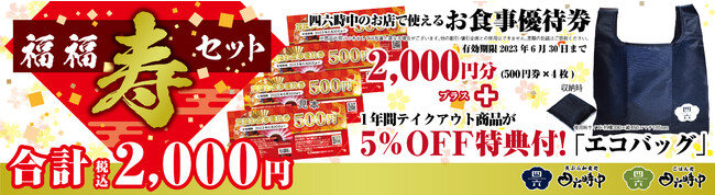 「エコバック」と全国の四六時中で使用できる「お食事優待券(2千円分)」がセットになったお得な「福福寿セット」(税込2,000円)の発売を12月20日からスタートいたします。オリジナル「エコバック」は『天ぷら和食処』『ごはん処』にご持参いただき、テイクアウト商品をご購入いただくと5%割引となる特典付きです。(2024年1月31日まで)