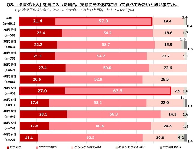 また、冷凍グルメを気に入ったら実際に飲食店を訪れたいと考える方の割合は8割弱と高く、中でも20代女性は9割超と高い傾向がうかがえました。今後は、飲食店の来店きっかけづくりとして、またお店の味を伝えるプロモーションツールとしての存在感も増しそうです。
