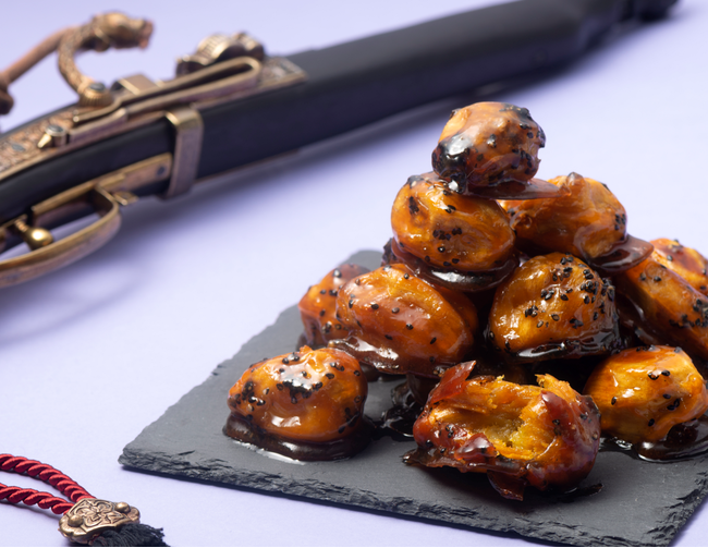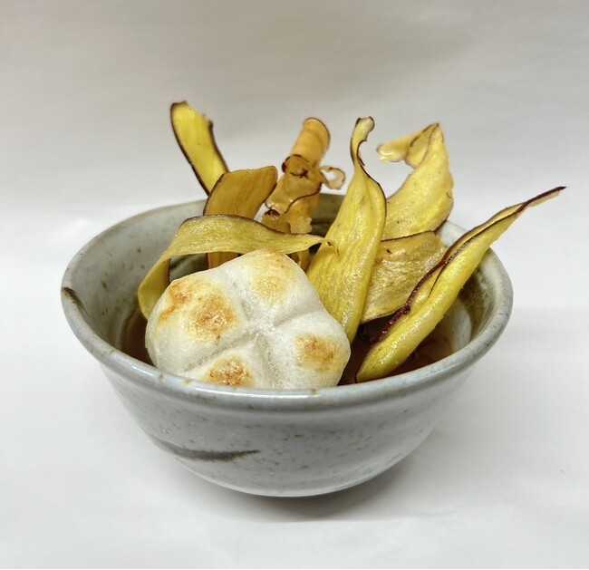 甘みが濃く、しっとりとした食感の“安納芋”をじっくりと素揚げし甘さを引き出して。飴を絡めてから、一度冷まし、さらにもう一度飴を絡めました。だしや醤油を加え、あえて少し焦がすことで旨みとコクを出した飴のおいしさもご堪能ください。