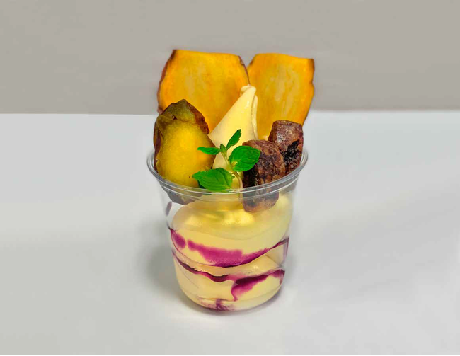 『日本さつまいもサミット2022』で「さつまいもオブ・ザ・イヤー」に輝いたブランドいも“五島ごと芋”などの4種のおいもが入った贅沢パフェです。ねっとり甘い“五島ごと芋”をたっぷり使ったソフトクリームに、もちもちの郷土菓子“揚げかんころ餅”、“シルクスイート”のミニ焼き芋、“紅はるか”のチップスをトッピング。焼き芋屋ならではの、おいもの魅力を引き出した一品です。