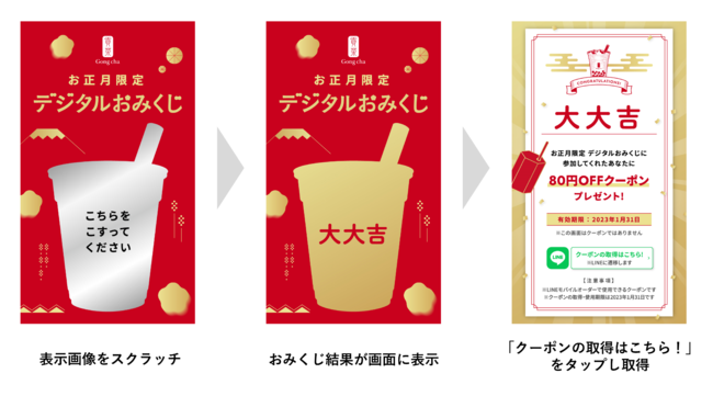 株式会社ゴンチャ ジャパン(本社:東京都港区、代表取締役社長:角田淳、以下GCJ)は、旧年のご愛顧への感謝の気持ちと新しい年がお客様にとって HAPPY な一年となるよう願いを込めて、2023年1月、「デジタルおみくじ」プレゼントキャンペーンを開催いたします。 第一弾として、2023年1月1日(日)~3日(火)の期間、ゴンチャにご来店の上ドリンクをご注文いただいた方を対象に、各店舗先着1,000 枚限定で「お正月限定 デジタルおみくじ」カードを配布いたします。