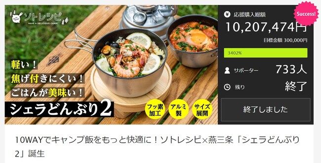 キャンプ飯レシピサイト「ソトレシピ(https://sotorecipe.com/)」を運営する株式会社ソトレシピ(本社:東京都渋谷区、代表取締役:千秋広太郎)は、アタラシイものや体験の応援購入サービス「Makuake(マクアケ)」にて2022年10月28日~12月19日まで先行販売した『ソトレシピプロダクツ』の新商品「シェラどんぶり2」のクラウドファンディング応援購入金額が1,000万円を突破いたしました。