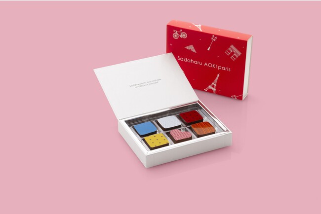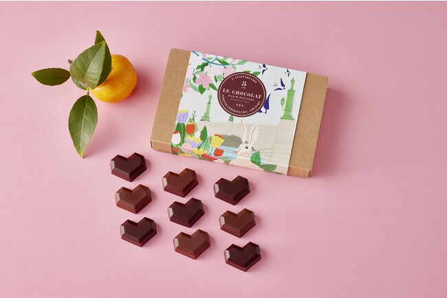 夕日に染まるパリの街並みを描いたボックスが美しいバレンタインコレクション。ダークとミルクのチョコレートをブレンドしたプレーンなガナッシュ、パリで採取された蜂蜜の香りが華やかなダークガナッシュなど、4種の限定ボンボンドゥショコラの詰め合わせです。