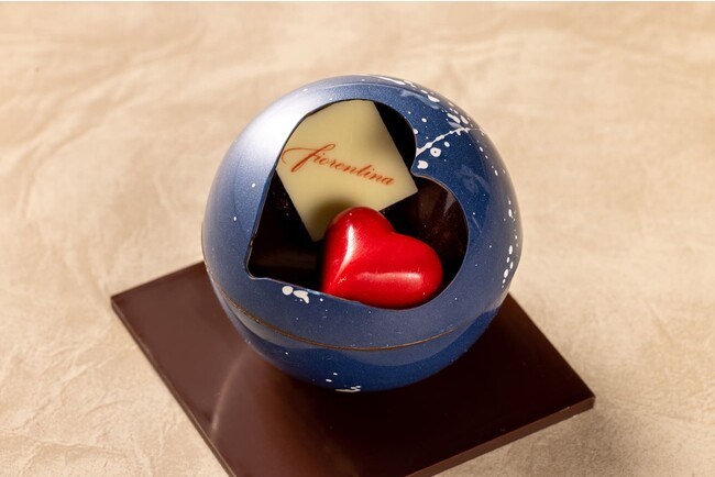 宇宙を思わせるデザインを施した直径7cmのチョコレートの球体に、ボンボンショコラなどを詰め合わせた「ショコラ コスモス」。ボンボンショコラはハート形のフレーズ、カフェ&グリオット、Grande H スイートの3種類。底にはアマンディーヌも入っています。