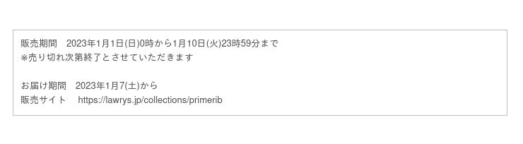 株式会社ワンダーテーブル[本社:東京都新宿区西新宿/代表取締役社長 秋元 巳智雄]では、2023年1月1日(日)午前0時より、アメリカンローストビーフ専門店「ロウリーズ・ザ・プライムリブ(以下、ロウリーズ)」の公式オンラインショップにて、プライムリブのお得な福袋を計300セット限定販売します。