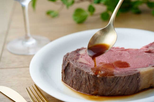 プライムリブは低温でローストして旨みを凝縮させた逸品です。 するっとナイフが入るほどの驚きの柔らかさと、肉本来が持つしっかりとした繊維質やジューシーさを楽しめます。添えられた深い味わいのオ・ジュソースがお肉の味を引き立てます。 お好みでホースラディッシュと「ロウリーズ・シーズンド・ソルト」を付けてお楽しみください。