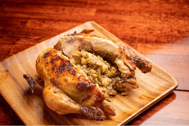 丸鶏にニンニクとハーブをベースとした詰め物を詰めて、特製のマリネ液でまるまる2日間かけてじっくり漬け込みます。マリネした丸鶏を専用のロティサリーオーブンで2時間かけてゆっくり焼き上げることで、ニンニクとハーブの香りが広がり胸肉もしっとりした食感で仕上げることが可能となりました。