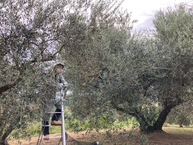 日本オリーブ株式会社の農園は、南に瀬戸内海が広がり、陽光がさんさんと降り注ぐ好立地にあります。今年は台風の被害も最小に食い止め、量こそ例年より少なめでしたが、一つ一つの実は健やかそのもの。丁寧に摘み取り、搾油までの時間も昨年より短縮しました。そして品種構成は爽やかで上品な花の香りを持つルッカ種がやや多め。青りんごの風味にやさしい奥行きを加え、プロポーションの整ったオイルに仕上がりました。