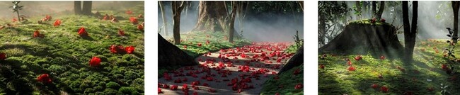「椿絵巻~東京椿インスタレーション・アート~」は、椿(ヤブツバキ)の大樹の下にふわりと舞い降りた赤い椿と、緑深き苔の美しいコントラストを庭園の山頂エリアにてご覧いただける「絵巻物」のような美しい光景です。
