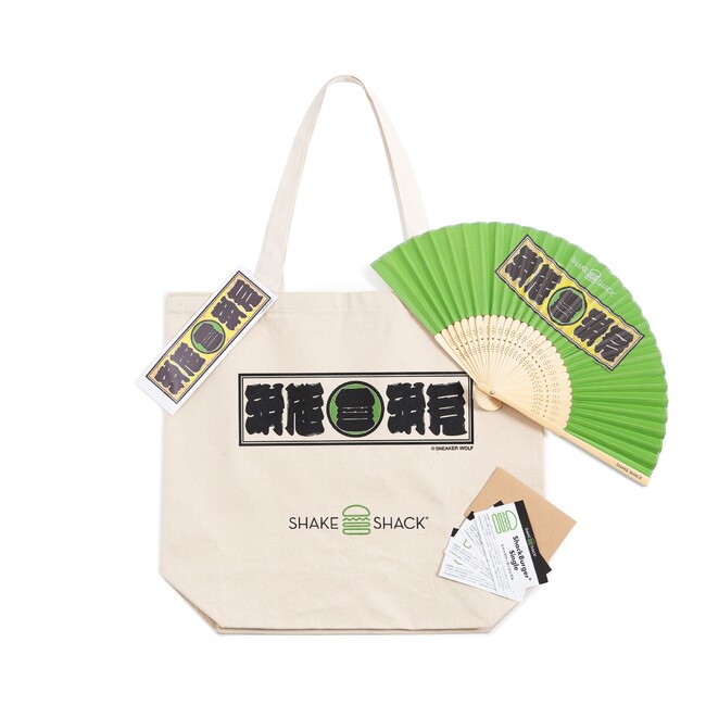 内容:SNEAKERWOLFコラボトートバッグ・扇子・ステッカー、ミールチケット4種(シャックバーガーシングル、チキンシャック、フライスモール、オリジナルレモネード)