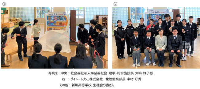 当日には、本校にて除幕式を開催し、新川高等学校 生徒会長 酒井 啓路さんより「地域への支援になれば良いと思います。この自販機は少しでも売れるように、生徒会のみんなで商品を選んでいます。」とコメントをいただきました。また、社会福祉法人海望福祉会 理事・総合施設長 大崎 雅子様より「今回の自販機設置により、子ども食堂への理解と応援の輪が繋がれば幸いです。」とお言葉をいただきました。