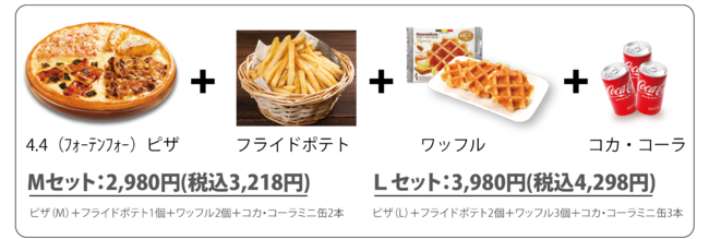 ピザ(L)+フライドポテト2個+ワッフル3個+コカ・コーラミニ缶3本