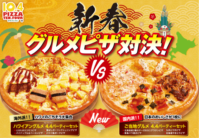 北海道発!宅配ピザ「テンフォー」を運営する株式会社テンフォー (本社・北海道函館市/代表・高橋仁志)からこの年末、ハワイのごちそうが大集合した“ハワイアングルメ4.4(フォーテンフォー)”が新登場!!日本のご当地グルメづくしの“ご当地グルメ4.4(フォーテンフォー)”とのグルメピザ対決が実現しました!その他、お正月の定番おもちピザは“北海道産小豆のあんバタおもちピザ”が新登場。業界初!?「ピザ福袋」や総勢104名様に豪華賞品が当たる「お年玉キャンペーン」と新年をハッピーに迎えるための企画が盛りだくさん!
