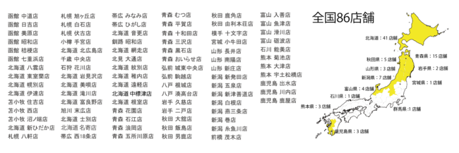 :全国86店舗中、北海道内41店舗。北海道の出店市町村数圧倒的NO.1!(自社調べ)