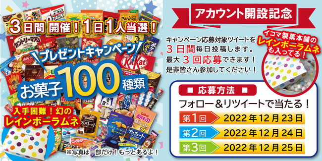 株式会社MDホールディングス(本社:大阪府東大阪市)は、Twitterのアカウント開設を記念して、抽選で限定3名様に100種類のお菓子が当たる「Twitterアカウント開設記念キャンペーン」を2022年12月23日(金)から12月25日(日)までの3日間実施いたします。