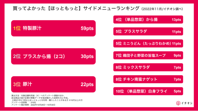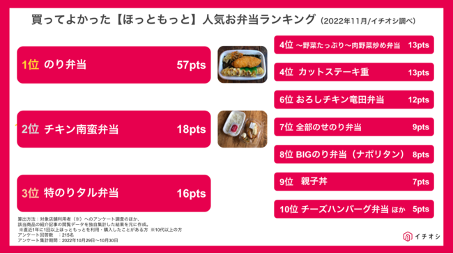 このたび、「イチオシ」内で支持を集める「ほっともっと」をテーマに、対象店舗利用者(※)へのアンケート調査のほか、該当商品の紹介記事の閲覧データを独自集計した結果を元に各部門の人気ランキングを作成いたしましたので発表いたします。