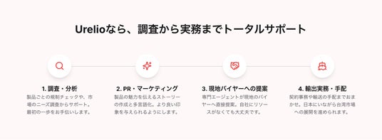 1. 調査から輸出実務までサポート規制調査・市場調査・製品PR作成といった準備段階から、現地営業提案・商談代行、契約事務、輸送手配まで、台湾市場への販路開拓に必要なすべてのプロセスを一気通貫でサポートします。