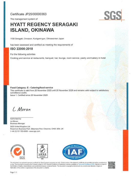 ハイアット リージェンシー 瀬良垣アイランド 沖縄(所在地:沖縄県恩納村)は、食品安全マネジメントシステムに関する国際標準規格である「ISO 22000:2018」の認証を、2025年11月26日付で取得いたしました。