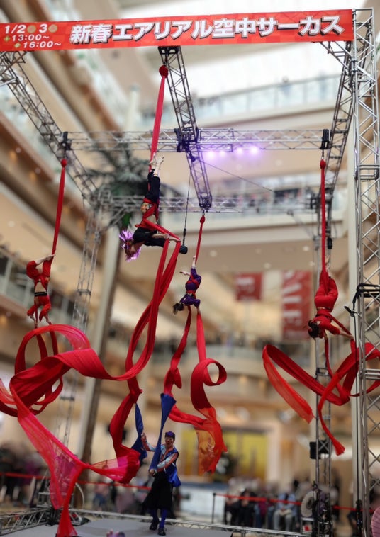 迫力のあるパフォーマンスを目の前で楽しめます!新春エアリアル空中サーカスショー今年で12回目となる、新春エアリアル空中サーカス。ダイナシティのお正月の風物詩として楽しまれており、シルク・ドゥ・ソレイユの登録キャストたちを輩出するエアリアル・アート・ダンス・プロジェクトのメンバーたちが地上8mの巨大ステージで繰り広げる驚異のエアリアルパフォーマンスは、音楽とダンスの華やかな饗演です。