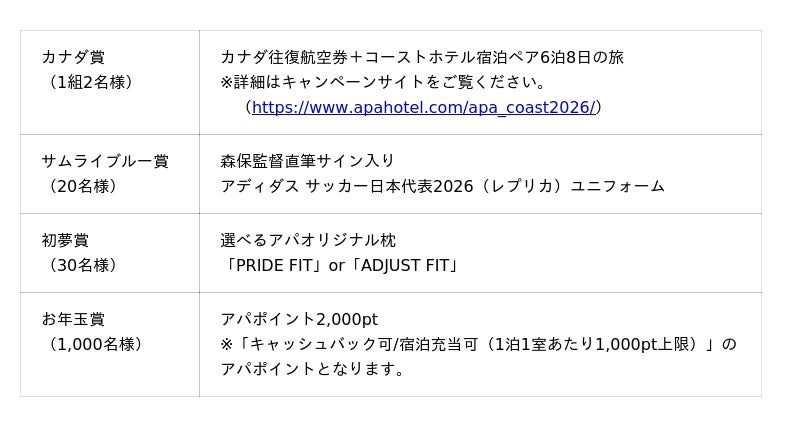 新春コーストホテルキャンペーンは、2026年1月1日(木)~2月28日(土)の期間で開催し、コーストホテルブランドを展開する「カナダ6泊8日の旅」や「森保監督直筆サイン入りユニフォーム」などの豪華賞品を抽選で総勢1,000名様にプレゼントします。応募方法は、アパホテル会員限定(登録無料の新規入会可)で、「アパ直」応募フォームで以下のキーワードを答えることで応募できます。