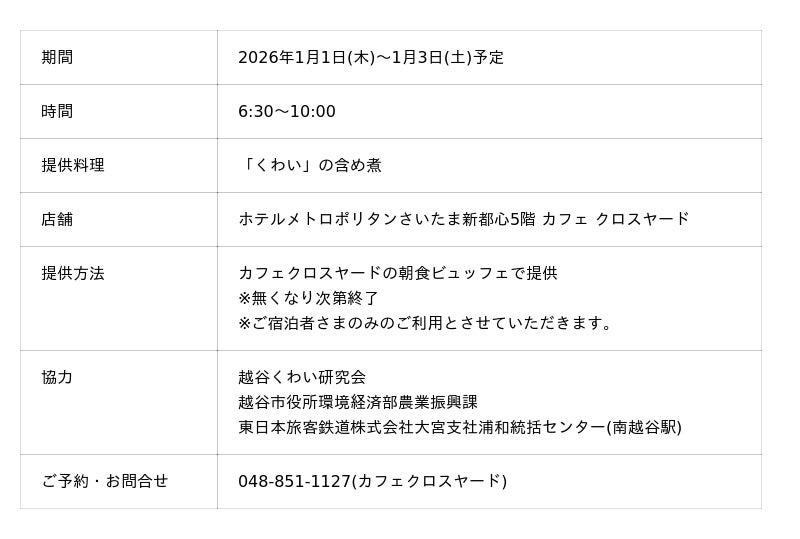 ホテルメトロポリタン さいたま新都心(所在地/さいたま市中央区、総支配人/櫻井浩一)のカフェ クロスヤードでは、地産地消、地域貢献活動の一環として、JR東日本南越谷駅社員の方々が栽培に携わった地元食材「くわい」を使ったお料理を、おせち料理の一品として1月1日(木)~1月3日(土)3日間限定でご朝食に提供いたします。