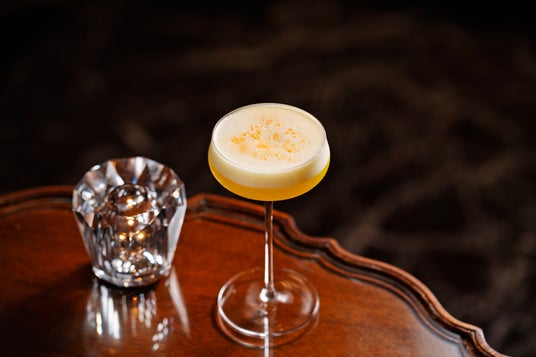 「接吻(恋人たち)」に着想を得た一杯。宗教美術の技法を駆使し、人間の結びつきを讃えたクリムトの精神に想いを馳せ、カクテルと人との繋がりをこの一杯に表現しました。泡盛「ZANPA 島バナナ酵母 25度」にパイナップルのジューシーな果実味と、シャルトリューズの繊細なハーブのニュアンスが織り成すハーモニー。グラスを傾けるたび煌めくパールパウダーが華やぎを添えます。