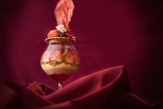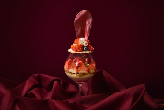 トップには、新鮮な苺の飾り切り、苺スライス、そして可愛らしいビオラをあしらい華やかに。ヨーグルトソルベには苺のコンポートをかけ、大粒の苺スライスをグラスの内側にぐるりと敷き詰めました。苺本来の鮮やかな色彩と美しい断面が際立つ、見た目にもこだわった贅沢な仕立てです。