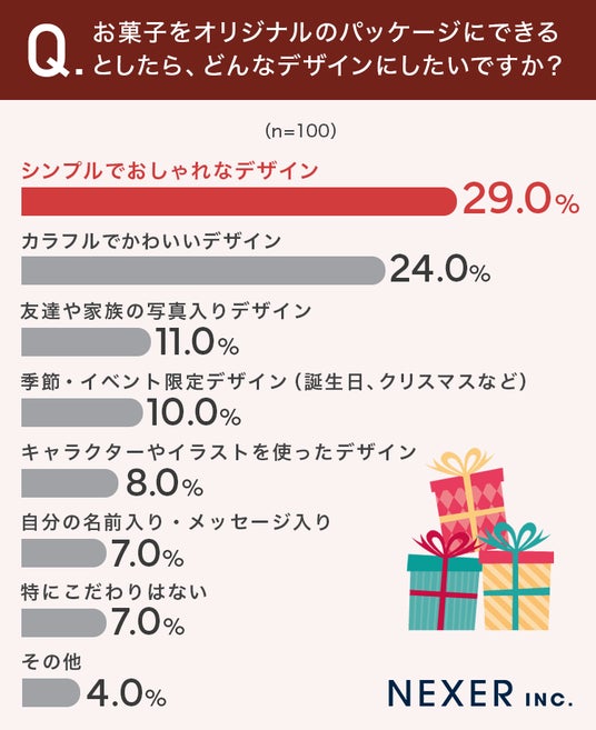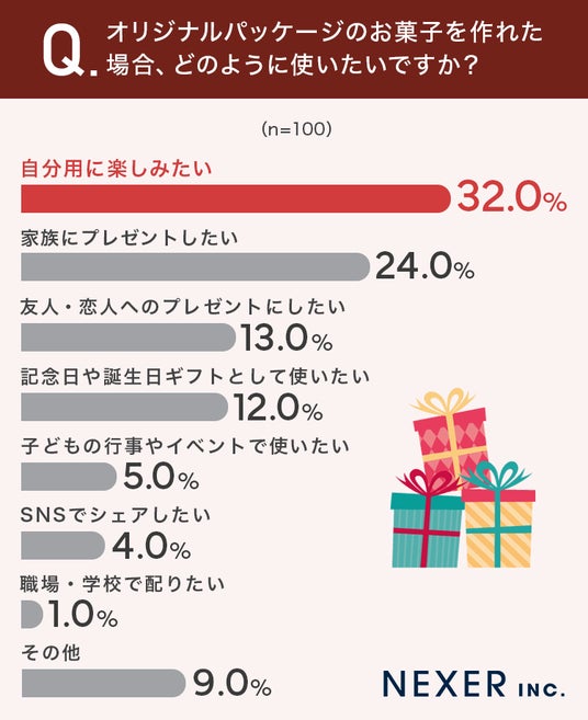 「喜ぶ顔が見たい」「思い出になる」といった回答からは、オリジナルパッケージがただの容器ではなく、気持ちを伝えたり思い出を残したりするきっかけとして期待されていることがわかります。