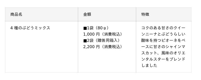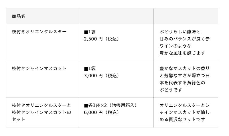 本商品は、2025年3月に発売した第1弾「りんご」、同年7月の第2弾「いちご」に続く、セミドライフルーツシリーズ第3弾商品です。2025年12月27日には「4種のぶどうミックス」を、また2026年1月下旬には、よりぶどうの芳醇な味わいをお楽しみいただけるプレミアム商品として、「枝付きオリエンタルスター」および「枝付きシャインマスカット」を販売いたします。