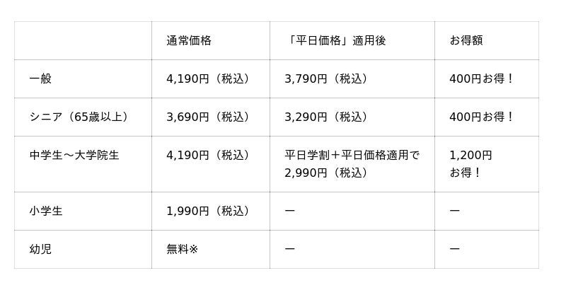 ※「平日価格」の対象は一般・シニア料金のお客様です。