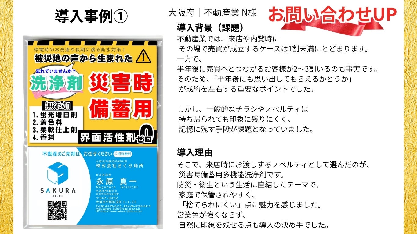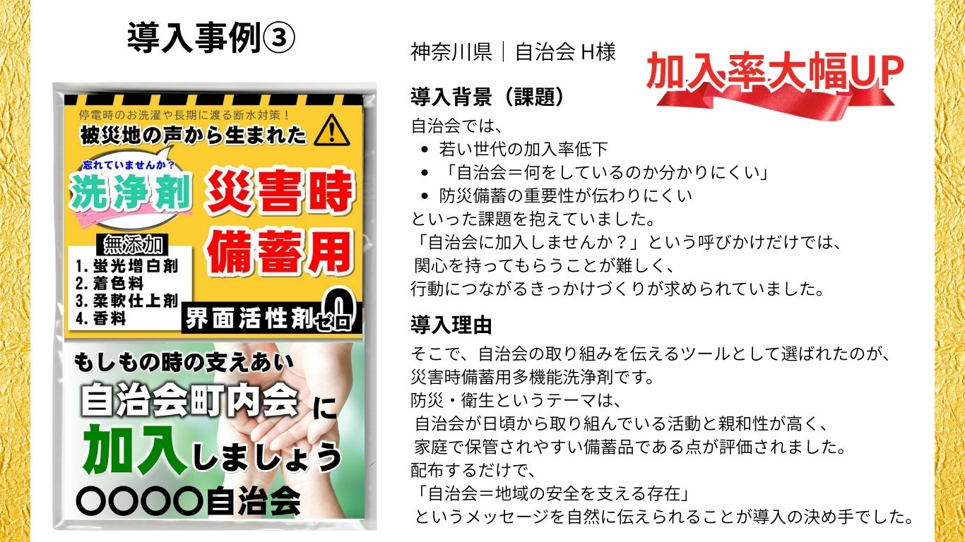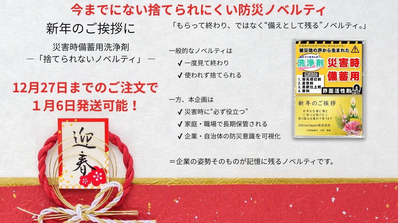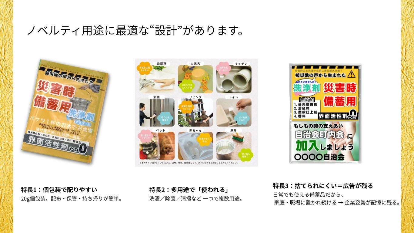 災害時備蓄用 多機能洗浄剤を活用した防災ノベルティです。