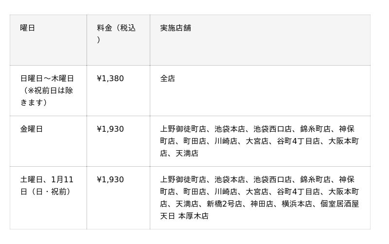 ・上野御徒町店、池袋本店、池袋西口店、錦糸町店、神保町店、町田店、川崎店、大宮店、谷町4丁目店、大阪本町店、天満店は¥1,930(税込)で金曜、土曜、祝前日も開催します