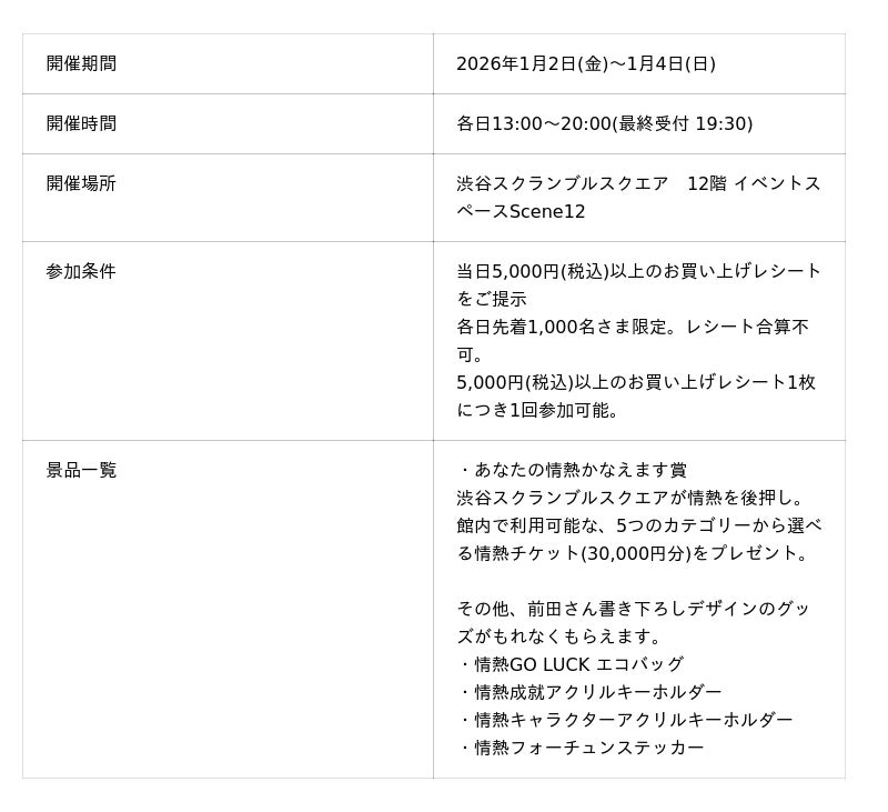 2026年1月2日(金)~4日(日)の3日間、12階イベントスペースScene12に超巨大なCAPSULEマシーン「情熱CAPSULE」が登場。期間中、当日5,000円(税込)以上のお買い上げレシートをご提示で各日先着1,000名さま限定で参加可能なはずれなしの情熱CAPSULEが体験可能。一人ひとりの情熱を応援するアイテムがもらえます。