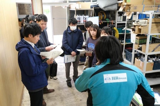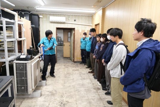 国立大学法人岡山大学(本部:岡山市北区、学長:那須保友)は、岡山商工会議所と連携し、学生と地域企業が協働してCO2排出量の可視化に挑む「カーボンフットプリント(CFP)算定プロジェクト」を推進しています。7月に実施したキックオフ・ワークショップに続き、2025年11月4日、有限会社東山冷機の本社工場を訪問し、再生フロンの製造プロセスを学ぶ工場見学を行いました。