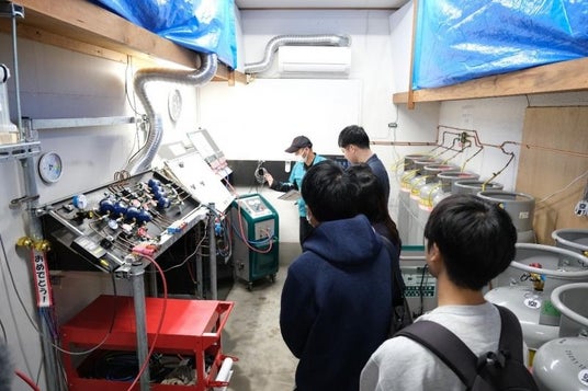 当日は、学術研究院社会文化科学学域(経済)の天王寺谷達将准教授のゼミに所属する学生ら4人が参加。現地では同社の小原章弘代表取締役より、再生フロンの回収から再利用までのプロセスについて詳細な説明がありました。学生たちは、再生の各工程や使用される機器の仕組み、品質管理の工夫などを間近で観察し、活発な質疑応答を交わしました。